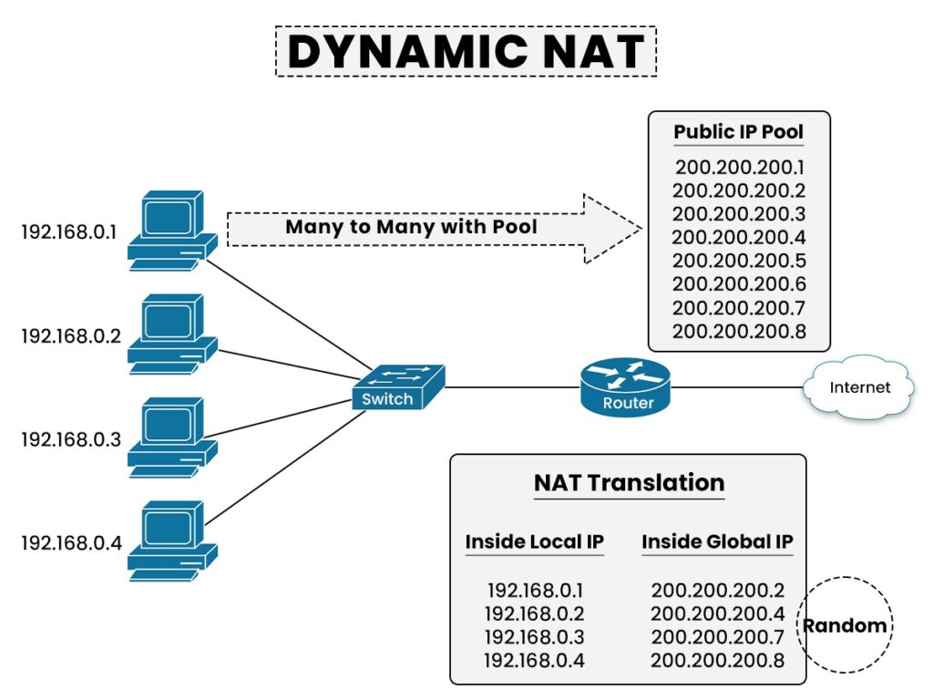 Dynamic NAT использует пул внешних IP-адресов. Каждый внутренний адрес при выходе наружу получает первый свободный внешний IP из этого пула.